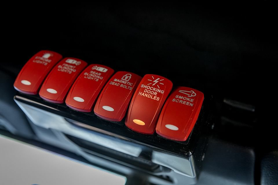 The Tank X uses a smoke screen that releases dense smoke at the press of a button to dissuade the enemy. It even gets military grade run flat tyres. This is basically a solid tyre within a tyre providing the capability of covering long distances at high speeds on damaged tyres. There are also powerful blinding lights that turn night into day and blind trackers at night. And lastly, the door handles can be electrified at the touch of a button to shock the intruder. Literally.