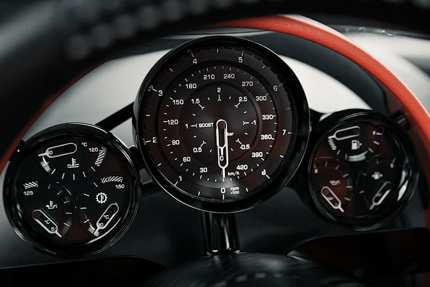 As with the exterior, the Koenigsegg CC850’s interior draws inspiration from the CC8S with its symmetrical, minimalistic design. This symmetrical layout isn’t merely a design choice but makes it possible for both left- and right-hand-drive versions to be built without great difficulty. Like the physical shift lever, the analog chrono cluster is a wonderfully retro touch before digital gauge clusters replaced them.