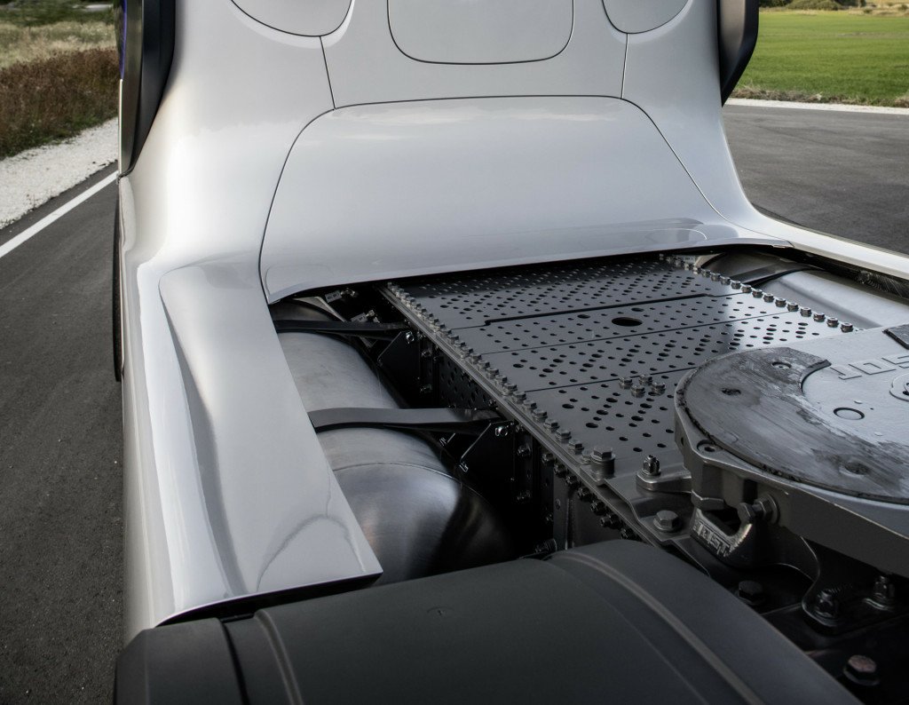 With a full tank of hydrogen, here stored in liquid form, Mercedes’ truck will be able to cover a distance of more than 620 miles, which is comparable to a diesel truck. The advantage over a battery-electric truck like the planned Tesla Semi, which is promised with 500 miles of range, is much quicker refueling times since hydrogen tanks can be filled in minutes, though finding hydrogen for sale is still next to impossible in most parts.