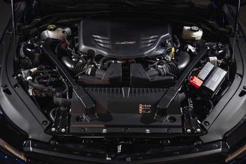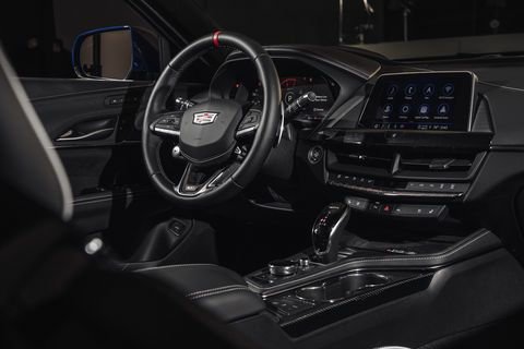 In Cadillac’s new naming system, “Blackwing” represents the most high-performance variant in a model range. Here, that means a revised version of the twin-turbo 3.6-liter LF4 V-6 familiar from the old ATS-V, with a new intake and exhaust system, new oil squirters, and in manual-transmission cars, titanium connecting rods. Power has increased, from 464 hp in the ATS to 472 hp in the CT4-V; torque remains unchanged at 445 lb-ft. The Tremec TR6060 six-speed manual is unchanged too, and like the ATS-V, the CT4-V Blackwing offers no-lift upshifts and automatic rev-matching on downshifts (which you can switch off if you like). Prefer not to shift yourself? A 10-speed automatic is optional, a 25 percent increase in gears over the past 8-speed.