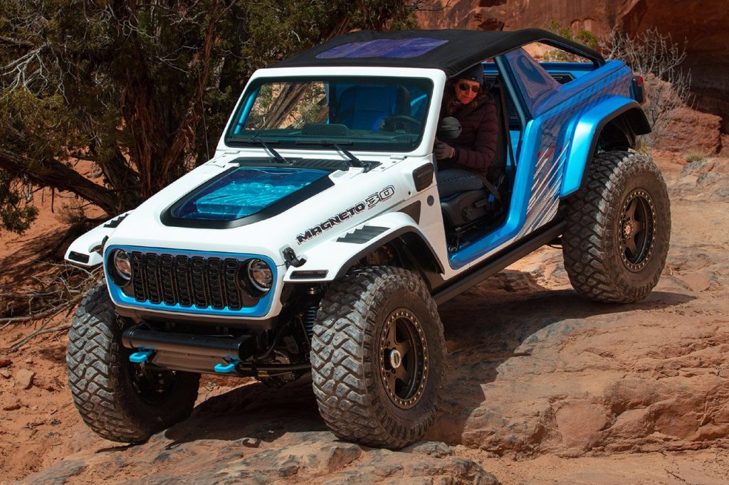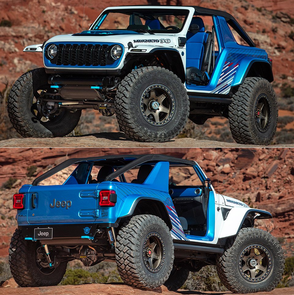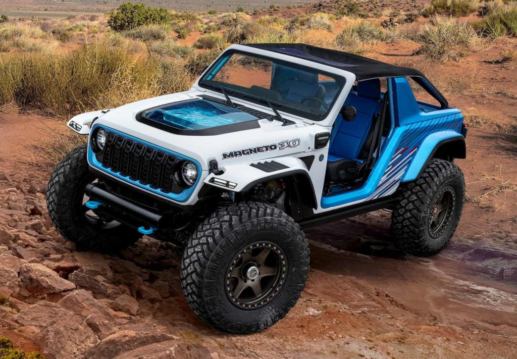 The futuristic 2023 Jeep Wrangler Magneto 3.0 Concept needs to become a production vehicle, as it’s based on a two-door 2020 Jeep Wrangler Rubicon. It’s been upgraded with a custom-built axial flux electric motor capable of up to 6,000 rpm generating 285 hp and 273 lb-ft of torque in standard mode, mated to a six-speed manual transmission for precise control.